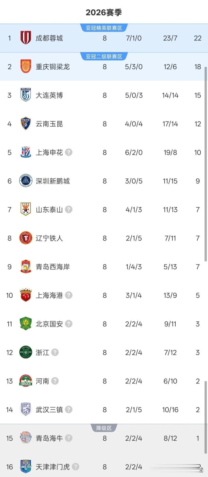 北京时间4月26日,随着第二个比赛日5场比赛顺利进行,2026赛季中超联赛第8轮比赛全部结束。8轮过后的积分榜,前5的球队积分全部上双,上海申花落后榜首的成都蓉城12分,仅剩下最后1支球队积分是负分。